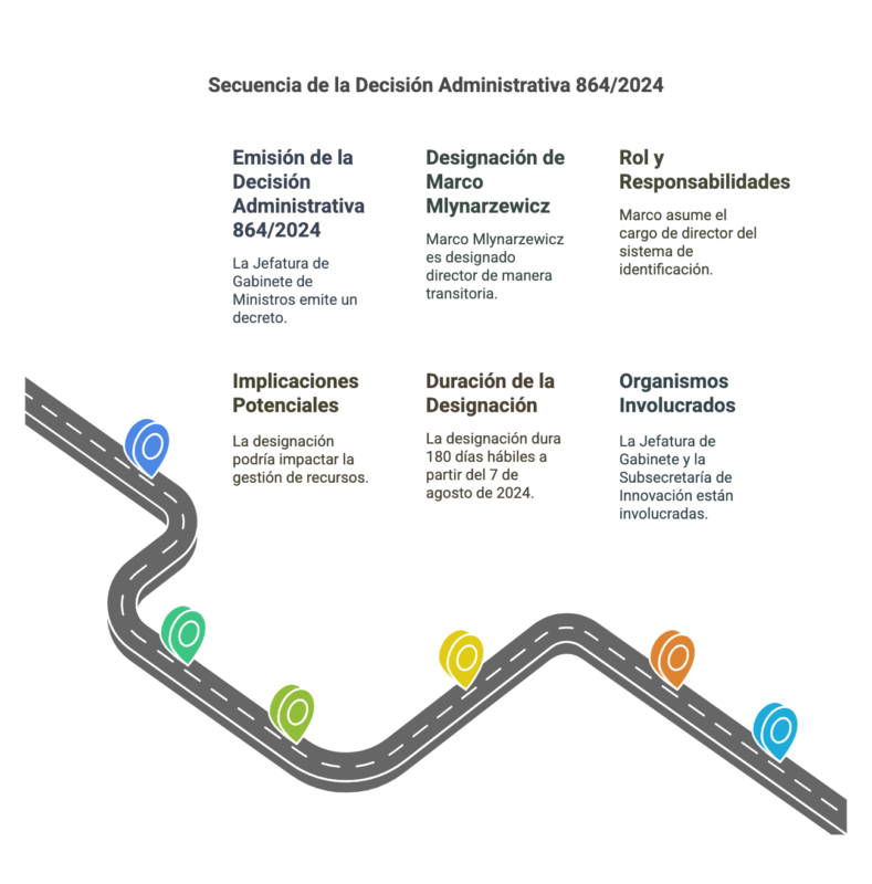 El 7 de agosto de 2024, el Jefe de Gabinete de Ministros de Argentina anunció la designación transitoria de Marco Mlynarzewicz como Director Nacional del Sistema de Identificación Nacional Tributario y Social. Esta decisión se formalizó a través de la Decisión Administrativa 864/2024, un acto administrativo que otorga a Mlynarzewicz la responsabilidad de liderar el sistema que gestiona la identificación tributaria y social a nivel nacional.