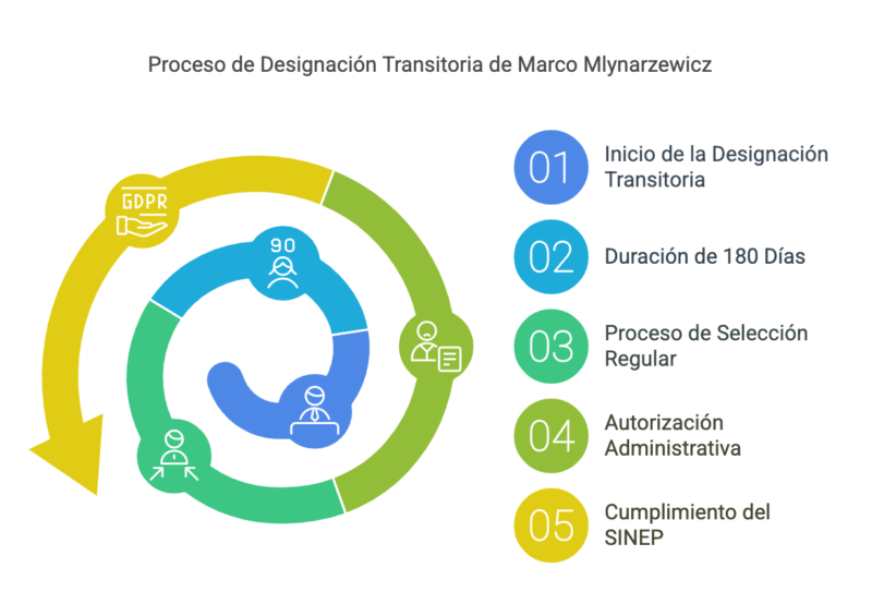 ¿Cuánto tiempo estará en el cargo Marco Mlynarzewicz? La designación de Marco Mlynarzewicz es transitoria, con una duración de 180 días hábiles a partir del 7 de agosto de 2024.